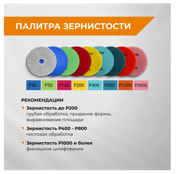 Внимание! Чем крупнее зерно (самое крупное Р30), тем быстрее происходит процесс шлифовки и грубее обрабатывается поверхность. Мелкие зерна (от Р1000) выполняют функцию полировальных кругов. Чем меньше зерно, тем чище будет поверхность.