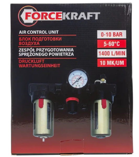 Блок подготовки воздуха 1/4" от бренда FORCEKRAFT представляет собой комплексное устройство, используемое для очистки, регулирования и смазывания воздуха перед его подачей в пневматическую систему.
