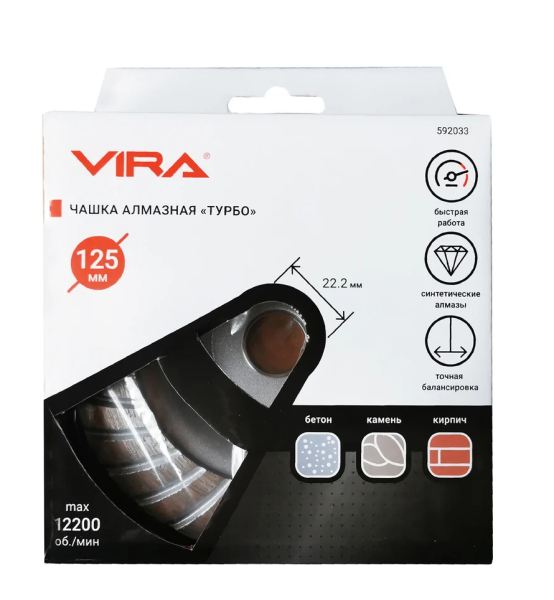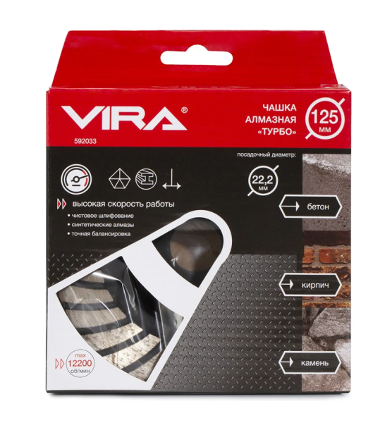 Чашка алмазная "турбо" 125мм используется для обработкии шлифования железобетона, мрамора, кирпича и камня. Данный тип хорошо подходит для выполнения точных работ. Изготовлена из высокопрочной углеродистой стали с алмазной напайкой. Сегменты типа "турбо" способствуют интенсивному охлаждению чашки и обеспечивают быструю, качественную шлифовку. Высокий ресурс и надежность этого инструмента, дают возможность получить гладкие поверхности на большом объеме обрабатываемых материалов. Поверхность чашки не требует водяного охлаждения во время работы.
