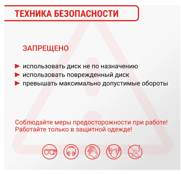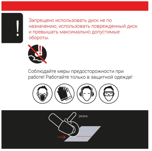 ВНИМАНИЕ! Соблюдайте меры предосторожности при работе!. Не использовать для шлифовки! Работайте только в защитной одежде! Запрещено использовать поврежденный отрезной диск и превышать указанные максимальные обороты.
