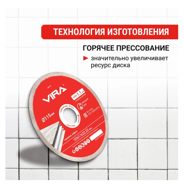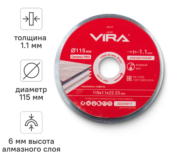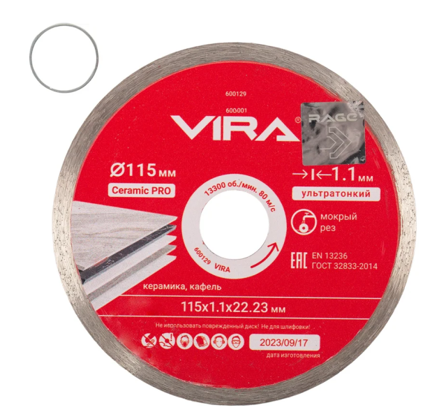 Технические характеристики диска алмазного по керамике VIRA 600129