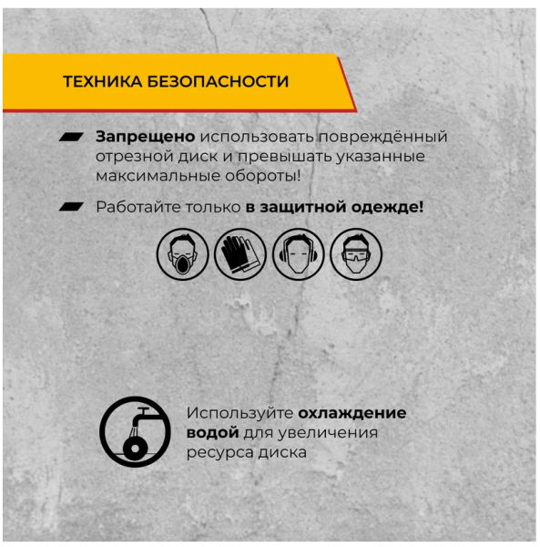 ВНИМАНИЕ! Соблюдайте меры предосторожности при работе! Работайте только в защитной одежде! Запрещено использовать поврежденный отрезной диск и превышать указанные максимальные обороты