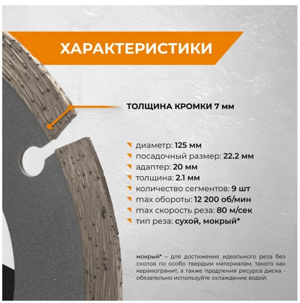 Тип реза: сухой рез, мокрый рез (способствует увеличению ресурса диска)