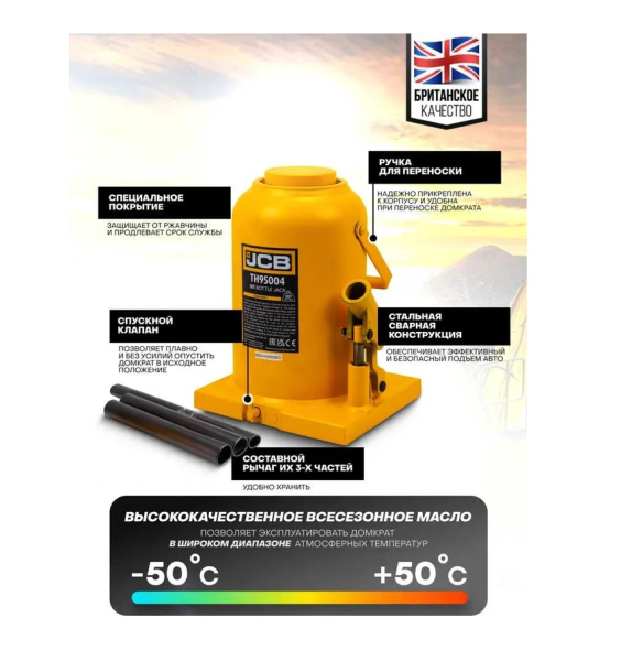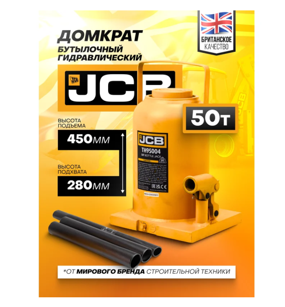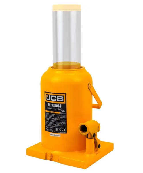 Бутылочный гидравлический домкрат от бренда JCB с грузоподъемностью до 50 тонн. Мощное и надежное средство для поднятия и удержания автомобилей.