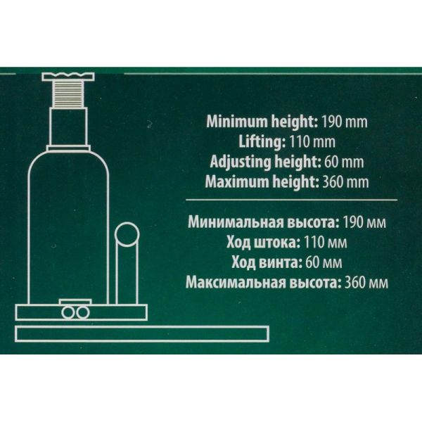 Домкрат гидравлический бутылочный, 10т (с предохранительным клапаном, минимальная высота: 190 мм, ход штока: 110 мм, ход винта: 60 мм, максимальная высота 360)