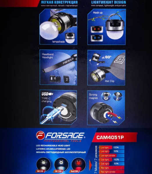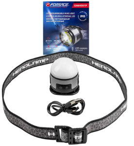 Налобный аккумуляторный фонарь Forsage — это универсальный осветительный аксессуар, который идеально подойдёт для использования в гараже, на рыбалке, в походе, кемпинге, туризме и при выполнении ремонтных работ. Благодаря эластичному ремешку, фонарь удобно крепится на голову, освобождая руки и обеспечивая направленное освещение. Дополнительно его можно закрепить на козырёк кепки с помощью клипсы или подвесить на крючок.