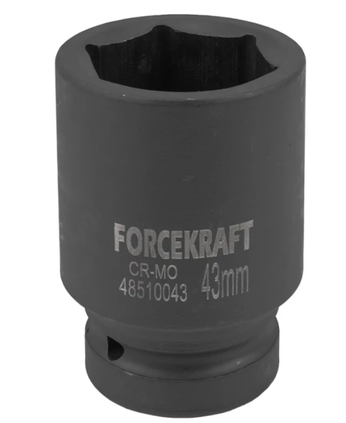 Торцевая головка ударная глубокая 43мм. Ударные торцевые головки с посадочным квадратом 1" шестигранные применяются как часть сборного инструмента в работе по обслуживанию экстремально нагруженных и крайне осложненных резьбовых соединений. Используется в тяжелой дорожной, строительной, сельскохозяйственной, горнодобывающей технике и оборудовании, при монтаже и обслуживании металлоконструкций строительных и инженерных сооружений и т.п. Удлиненные головки позволяют работать с крепежом, расположенных в углублениях или на длинных шпильках. Материал изготовления Хром-Молибден.