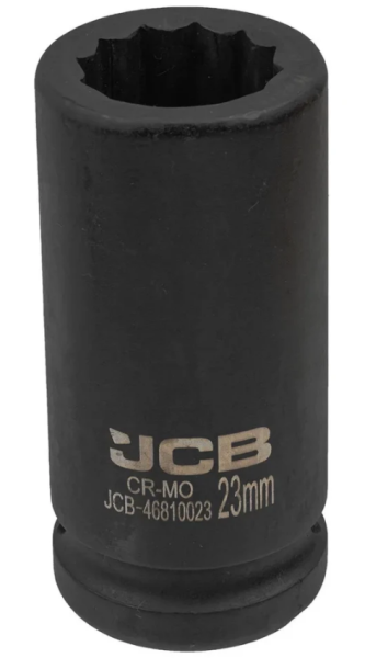 Торцевая головка ударная глубокая 23мм. Ударные торцевые головки с посадочным квадратом 3/4" применяются как часть сборного инструмента в работе по обслуживанию экстремально нагруженных и крайне осложненных резьбовых соединений. Головка имеет 12-гранный профиль, который позволяет работать как с шестигранным, так и двенадцатигранным крепежом, то есть является более универсальным и прекрасно подходят для работы в условиях ограниченного пространства, так как они надеваются на крепеж под большим количеством углов, чем шестигранные. Используется в тяжелой дорожной, строительной, сельскохозяйственной, горнодобывающей технике и оборудовании, при монтаже и обслуживании металлоконструкций строительных и инженерных сооружений и т.п. Удлиненные головки позволяют работать с крепежом, расположенных в углублениях или на длинных шпильках. Материал изготовления Хром-Молибден.