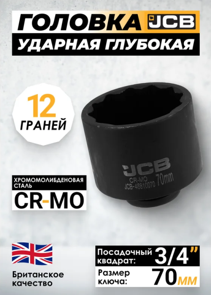 Ударная глубокая головка JCB 3/4" (19 мм) — это инструмент, созданный для работы с крепежом в условиях повышенной нагрузки. Благодаря 12-гранному профилю обеспечивается плотный контакт с гайками и болтами, что снижает вероятность повреждения граней и делает процесс откручивания или затягивания более безопасным и быстрым.