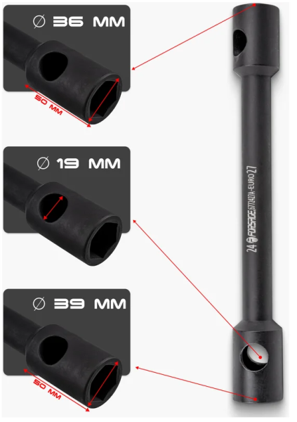 Удобство использования. Ключ оснащен двумя торцевыми головками с внутренним диаметром 24х27мм. с обеих сторон. Наружный диаметр головки соответственно: 36 и 39мм, высота- 50мм. Отверстие под монтировку 19мм.