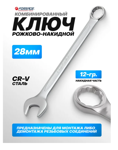 Ключ комбинированный рожково-накидной 28 мм от бренда Forsage предназначен для монтажа и демонтажа, а также для закручивания или раскручивания гаек, болтов и прочих крепежных изделий.