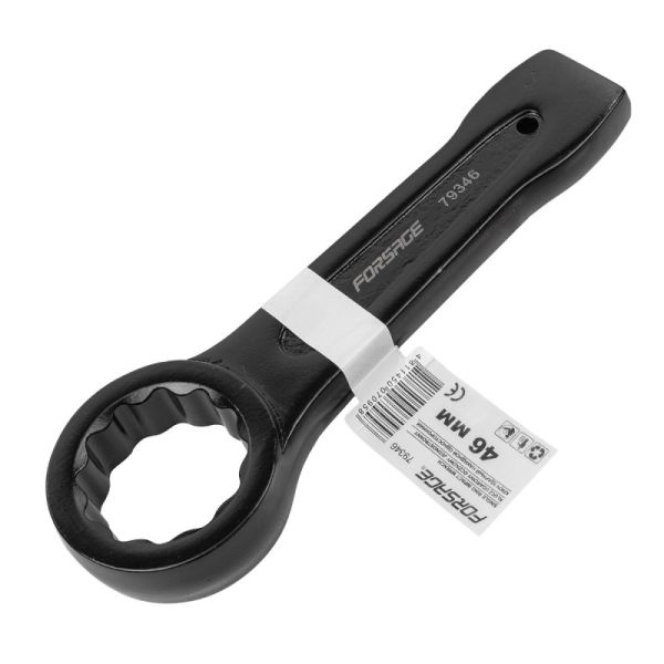 Ключ накидной ударный усиленный 46 мм односторонний используется для закручивания или раскручивания резьбовых соединений, в различных областях промышленности. Его усиленная конструкция позволяет использовать его в условиях, где нет возможности применить длинный рычаг. Ключ оснащен рукояткой с ударным концом, который не вибрирует и исключает возможность изгиба. Это обеспечивает точность и удобство при работе с инструментом. Рабочая поверхность предназначена для ударных воздействий с целью увеличения усилия при работе с тугими крепежными соединениями, с его помощью можно выкручивать и закручивать резьбовые крепежные элементы. Изготовлен из высокопрочного хромомолибденового сплава (Cro-Mo). Отличается износостойкостью, антикоррозийными свойствами.