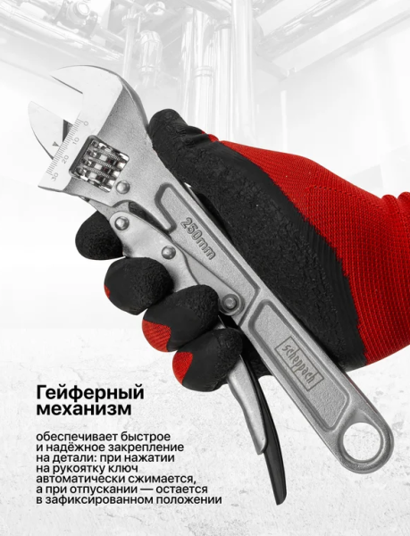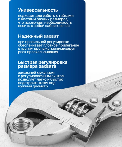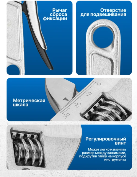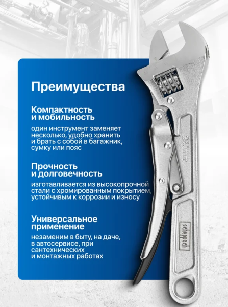 Универсальность применения – подходит для сантехнических, слесарных, монтажных и бытовых задач, заменяя сразу несколько гаечных ключей.