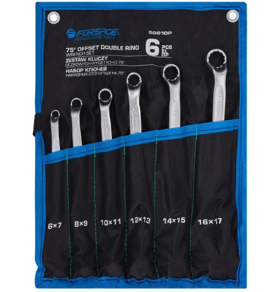 Набор накидных отогнутых ключей Forsage, 6 предметов — это практичный комплект для работы с крепежом в труднодоступных местах. Благодаря углу изгиба 75°, ключи обеспечивают удобный доступ к гайкам и болтам, расположенным в углублениях или под наклоном.
