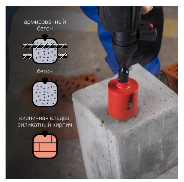 Назначение: для сверления отверстий в армированном бетоне с максимальным диаметром арматуры 22 мм, бетоне, кирпиче, силикатном кирпиче, камне