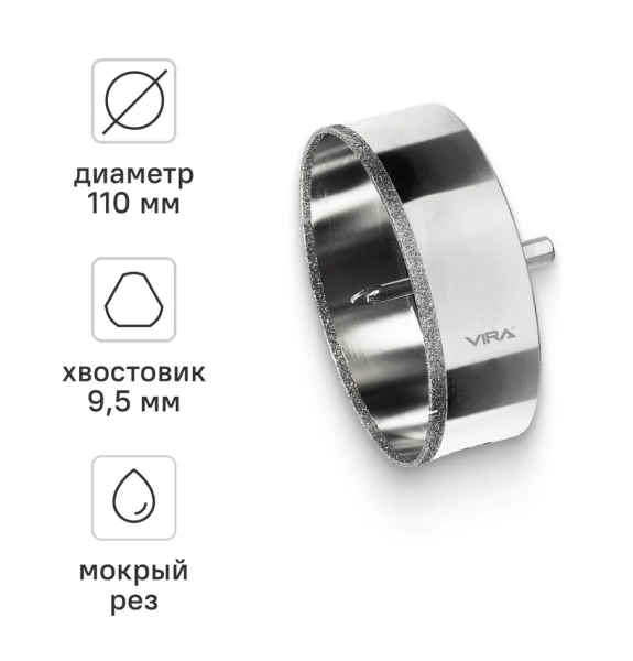 Коронка алмазная по керамике VIRA 110 мм трехгранный хвостовик