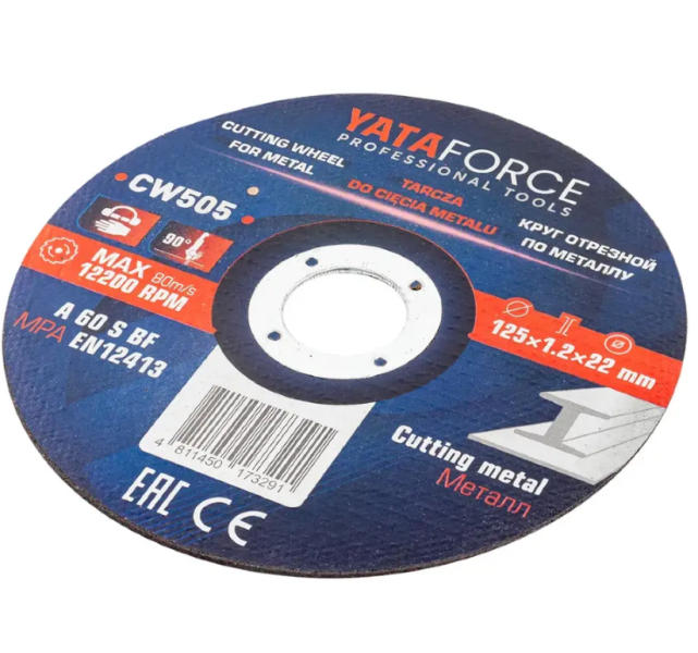 Отрезной круг с размером 125x1.2x22.23мм. отлично подойдет для качественной резки металла. Внутренний посадочный диаметр равен 22.23 мм. Внешний диаметр диска отрезного равняется 125 мм. Толщина абразивного круга - 1.2 мм, что позволяет легко, аккуратно и быстро обрабатывать металлическую поверхность. Небольшая толщина диска не дает обрабатываемому материалу сильно нагреваться. Материал отрезного диска - электрокорунд. Максимальная скорость вращения - 80м/с.