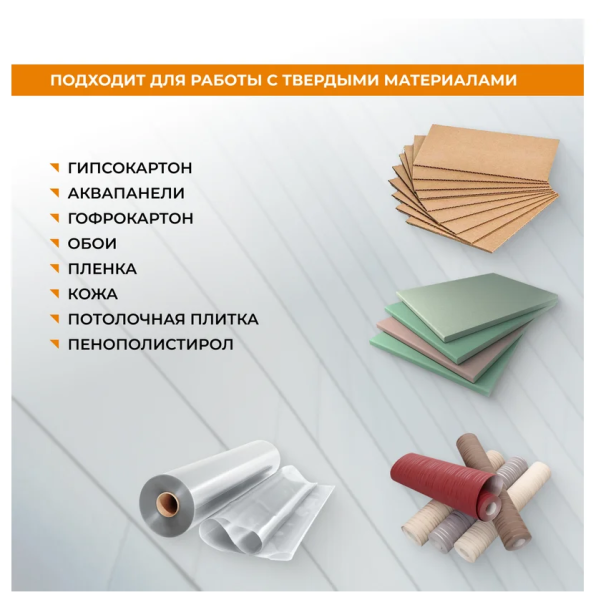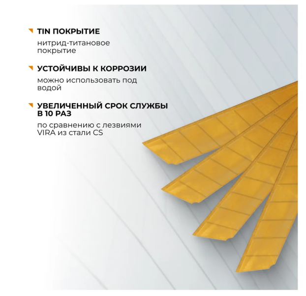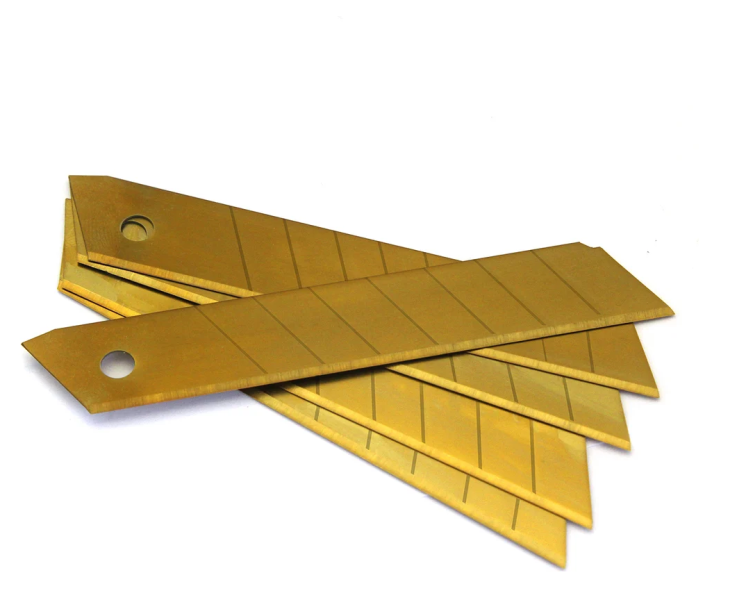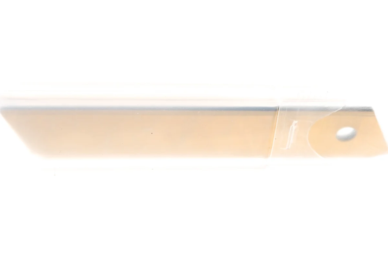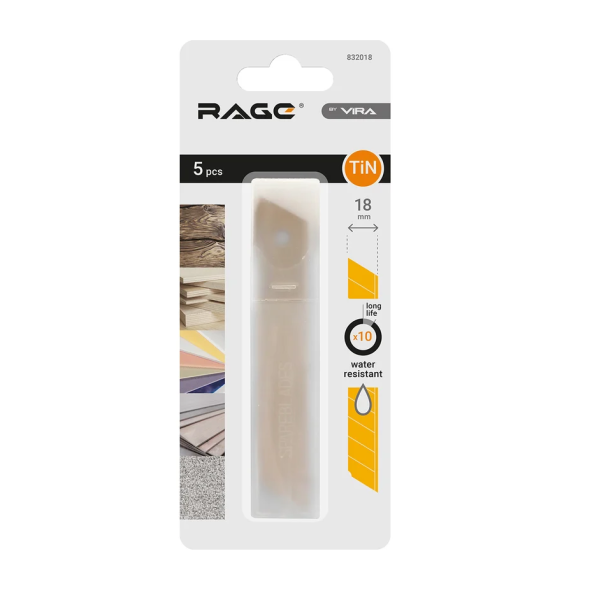 Набор включает в себя 5 сегментированных лезвий в контейнере. Используются для резки гипсокартона, аквапанелей, гофрокартона, обоев, пленки, кожи, потолочной плитки, пенополистирола. Ширина лезвий: 18 мм, длина: 70 мм, толщина: 0,6 мм. Выполнены из высокоуглеродистой стали с нитрид–титановым покрытием, что обеспечивает их отличную режущую способность, прочность и срок эксплуатации в 10 раз больший, по сравнению с обычными лезвиями. Абсолютно устойчивы к коррозии, вплоть до возможности их использования под водой.