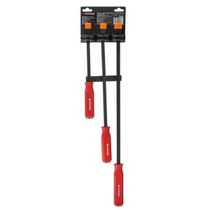 Комплект монтировок с прорезиненными рукоятками 3 предмета на пластиковом держателе предназначен для демонтажа различных механизмов, конструкций, деталей. Комплект включает в себя три монтировки разных размеров, которые позволяют выполнять различные виды работ: монтировка длиной 300 мм; монтировка 430 мм; монтировка 610 мм. Монтировки имеют угловой кончик, который обеспечивает дополнительную точку рычага для работы на узких участках, а заостренные концы легко помещаются между соединяемыми деталями, стержни имеют квадратное сечение для более удобной работы. На конце рукоятки имеется стальной затыльник для ударных нагрузок. Стержень прокован через рукоятку, что позволяет наносить удары по инструменту, не повреждая рукоятку. Эргономичная форма рукоятки позволяет избежать усталости рук и обеспечивает комфорт при длительном использовании монтировок. Инструменты выполнены из высококачественной стали с оскидированным покрытием, не подвержены деформациям, точно и полно передает усилие в рабочую зону. Набор монтировок может быть использован как профессионалами, так и любителями для выполнения различных монтажных работ.