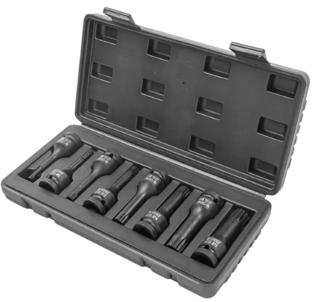 Набор из 8 головок-бит ударных SPLINE с посадочным квадратом 1/2". Головки изготовленных из хромомолибденовой стали (CR-Mo). Применяются для проведения слесарно-монтажных работ с механизированным инструментом ударного действия, при работе с высоконагруженными или осложненными резьбовыми соединениями. Устойчивы к высоким динамическим нагрузкам. Используются с ударным электро- и пневмо-инструментом и ручным приводом на СТО и в гараже. Размеры головок: M5, M6, M8, M10, M12, M14, M16, M18.