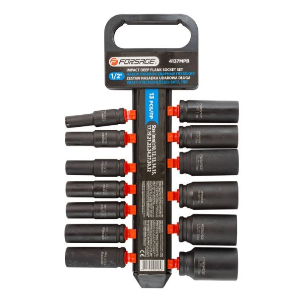 Набор из 13 торцевых 6-гранных ударных глубоких головок 1/2"на пластиковом держателе.