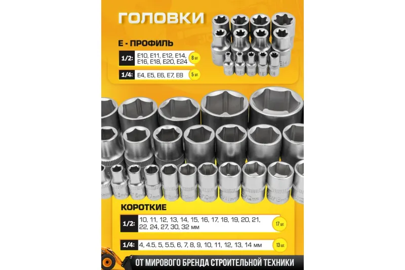 Инструменты выполнены из хромованадиевой стали (CrV), что обеспечит долговечность и надежность. Посадочный квадрат: 1/2", 1/4". Тип головок: 6-гранные, Е-профиль, короткие, глубокие.