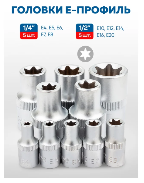Тип головок: 6-гранные и Е-профиль, что делает их совместимыми с большинством моделей автомобилей.
