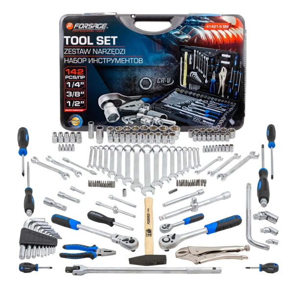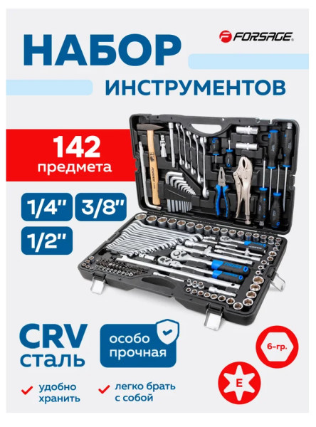 Набор инструментов Forsage из 142 предметов — это универсальный комплект, который станет незаменимым помощником в любой мастерской, на СТО, в гараже, на даче, в дороге и даже в быту. Благодаря высокому качеству и разнообразию инструментов, этот набор идеально подходит как для профессионалов, так и для автолюбителей, домашних мастеров и строителей.