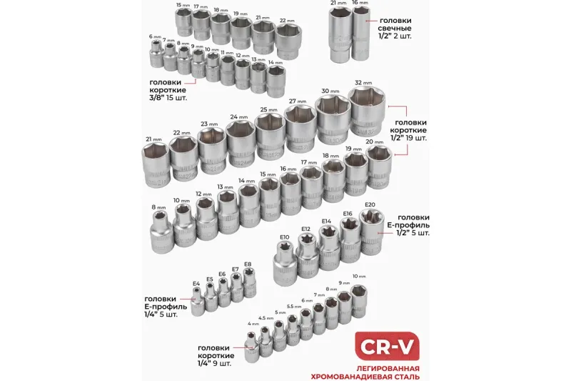 головки 1/2"Е-профиль 38 мм: Е10, Е12, Е14, Е16, Е20;