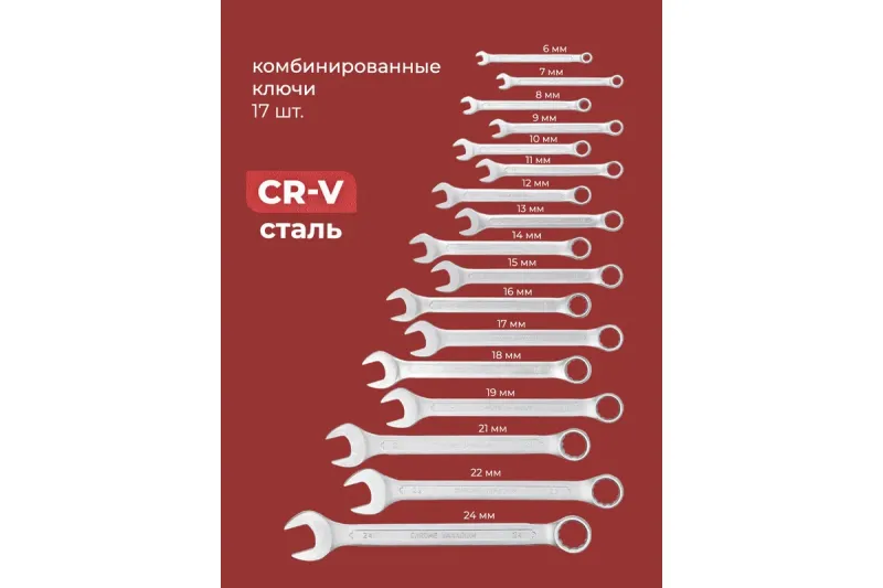 ключи комбинированные рожково-накидные: 6, 7, 8, 9, 10, 11, 12, 13, 14, 15, 16, 17, 18, 19, 21, 22, 24 мм;