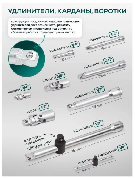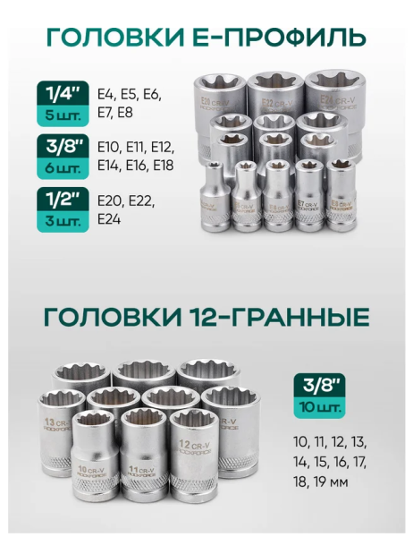 Посадочные квадраты 1/4", 3/8", 1/2" и различные типы головок (6-гранные, 12-гранные, Е-профиль, короткие, глубокие) позволяют работать с разнообразными крепежными элементами.