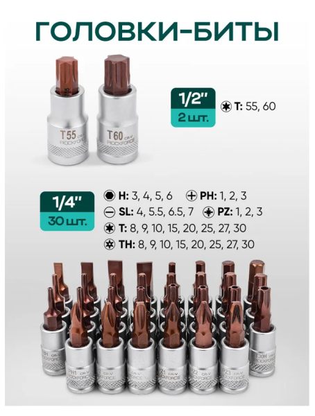 Головки-биты 1/4": HEX: 3, 4, 5, 6 мм.; T: T8, T9, T10, T15, T20, T25, T27, Т30 ТТ: T8H, T9H, T15H, T20H, T25H, T27H, T30H; SL: 4, 5.5, 6.5, 7 мм.; PH: РН.1, РН.2, РН.3; PZ: PZ.1, PZ.2, PZ.3