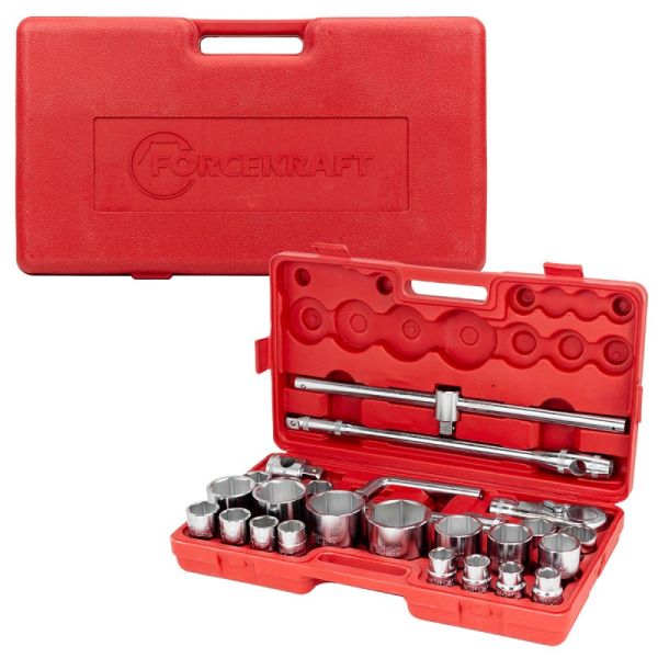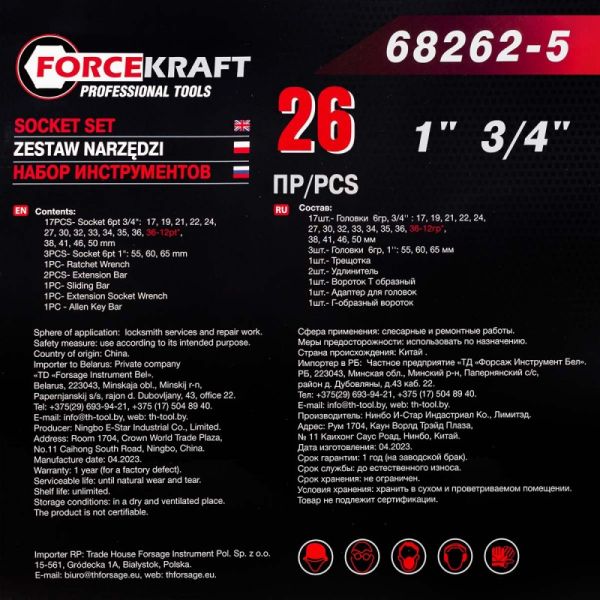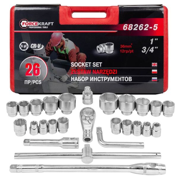 Набор инструментов с посадочным квадратом 3/4"" и 1". Набор включает в себя ударные головки, трещотку, воротки и удлинители. Они изготовлены из высококачественной хромванадиевой стали (Cr-V), что обеспечивает им прочность и долговечность. Головки предназначены для зажима/разжима деталей и другой работы внутри механизмов. Они могут использоваться в автомобильном ремонте, строительстве, промышленных процессах и других областях. Способны выдерживать значительные нагрузки и удары, что позволяет работать с более тугими крепежными элементами и устойчивы к повреждениям. Трещотка и воротки используются вместе с головками для зажима/разжима внутри различных механизмов. Удлинители применяются при работе в труднодоступных местах. Незаменимый инструмент в арсенале любого автомеханика или промышленного работника, который работает с крепежными элементами. Они обеспечивают быстрое и эффективное решение задач, связанных с крепежом. Комплектация: Головки 6-гранные 3/4": 17-19-21-22-24-27-30-32-33-34-35-36-36(12-гран.)-38-41-46-50 мм; Головки 6-гранные 1": 55-60-65 мм; Трещотка 3/4"500мм; Адаптер 3/4"(F)-1"(M); Удлинитель под вороток 490мм; Удлинитель под вороток 200мм; Вороток Г-образный 200мм; Вороток Т-образный 490мм.