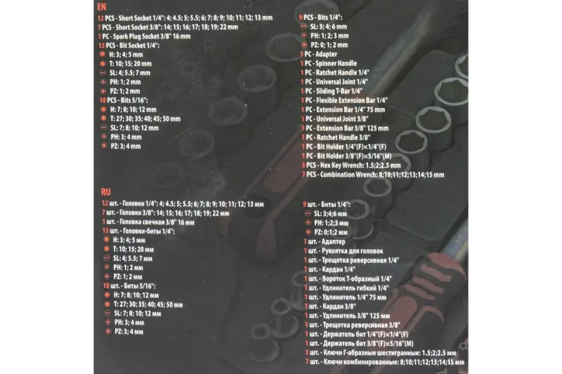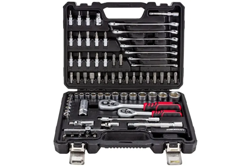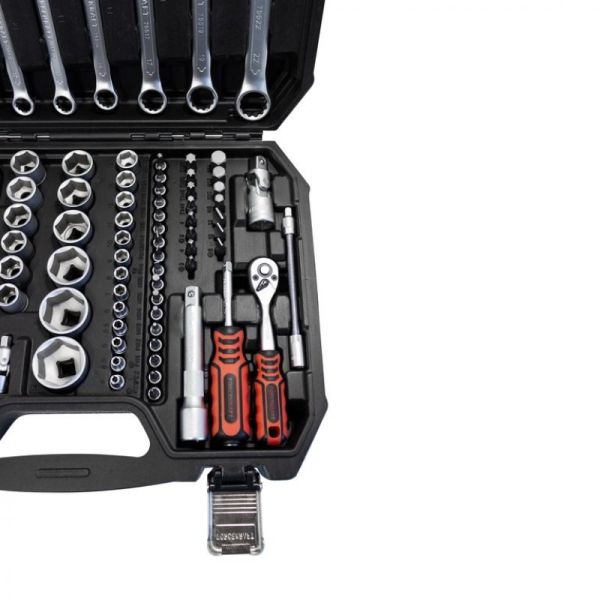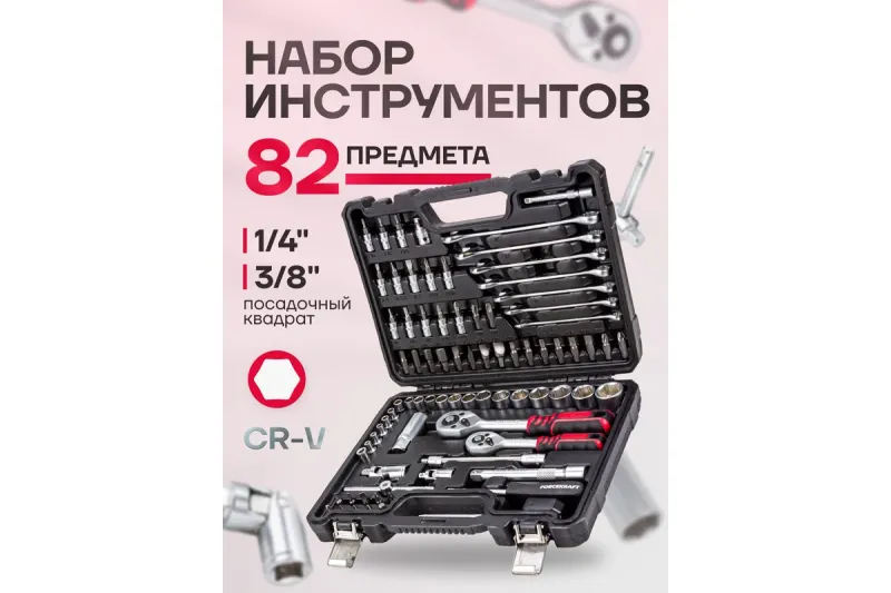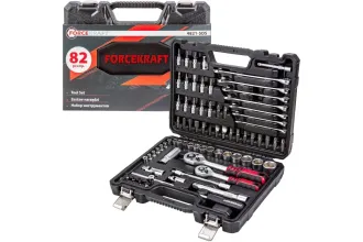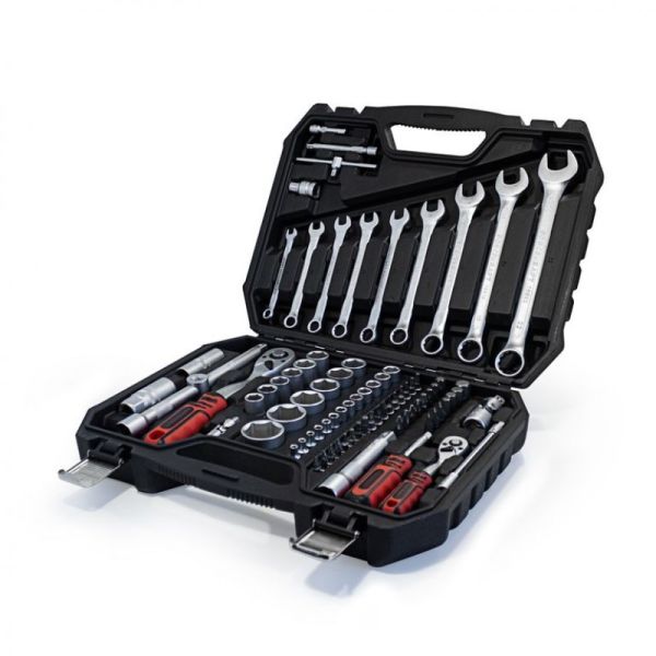 Этот набор инструментов в чемодане профессиональный включает в себя практически всё, что необходимо для большинства ремонтных работ - как в гараже обычного автолюбителя, так и в боксе специализированного сервиса. В представленный набор инструментов 82 предмета входят два вида держателей с трещотками, несколько переходников и карданов, множество типоразмеров торцевых насадок и бит, а также максимально полезный в работе комплект из 9 единиц комбинированных рожковых и накидных ключей.