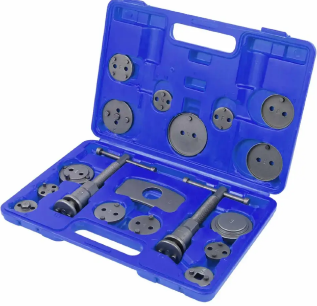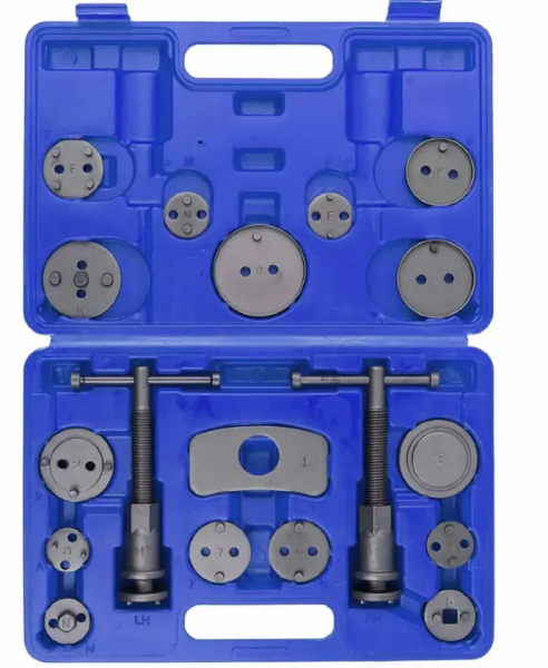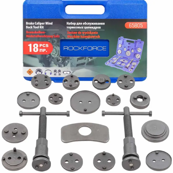 Набор инструментов для обслуживания тормозных цилиндров предназначен для вдавливания цилиндров суппортов автомобилей при ремонте и обслуживании тормозной системы. Разработан для работы с различными типами тормозных цилиндров, включая цилиндры с правым и левым приводами. Это позволяет использовать набор для обслуживания широкого спектра автомобилей. Набор включает в себя различные инструменты, необходимые для выполнения различных операций по обслуживанию тормозных цилиндров, включая снятие, установку, регулировку и замену деталей. Наличие всех необходимых инструментов в одном наборе упрощает и ускоряет процесс обслуживания. Инструменты в наборе изготовлены из прочных и долговечных материалов, таких как высококачественная сталь. Это обеспечивает долговечность и надежность инструментов при выполнении задач по обслуживанию тормозных цилиндров. В состав набора входят: насадки- адаптеры (15 шт.), планка-упор (1 шт.), ключ с левосторонней резьбой ( 1шт.), ключ с правосторонней резьбой (1шт.)