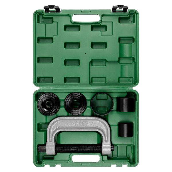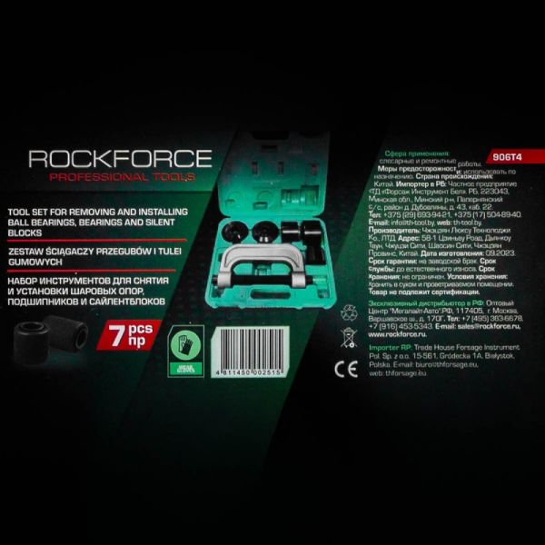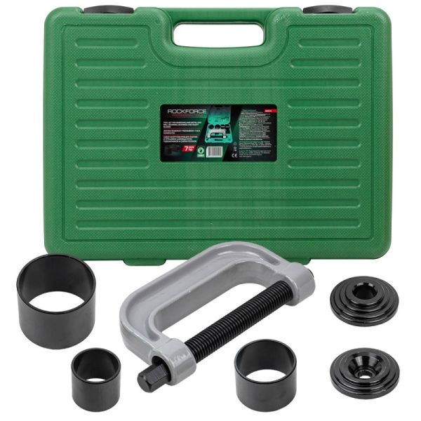 Набор инструментов для снятия и установки шаровых опор, подшипников и сайлентблоков в кейсе из 7 предметов от бренда ROCKFORCE подойдёт для применения в гараже, домашней мастерской, на СТО и в сервисном центре. Специально разработан для снятия и установки деталей тугой посадки, такие как шаровые опоры, универсальные шарниры. Модель оптимальна для установки и снятия шаровых опор, а также других работ по ремонту рулевого узла. Комплектующие изготовлены из прочного материала, устойчивого к механическому воздействию.