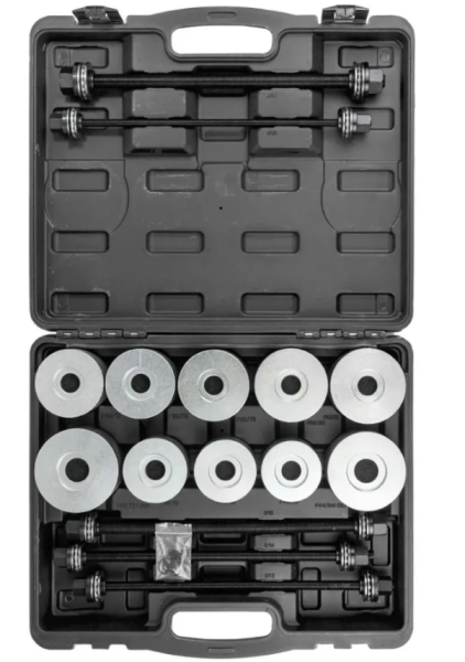 Набор для замены сайлентблоков, втулок и подшипников предназначен для проведения ремонта подвески автомобилей. Это универсальный инструмент, который обеспечит вам высокое качество работы и удобство в использовании при ремонте автомобилей. Комплект монтажных и демонтажных приспособлений предназначен для мастеров автосервиса и СТО.