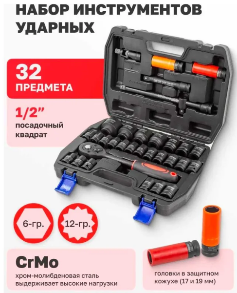 Комплектация: головки торцевые 6-гранные: 8, 9, 10, 11, 12, 13, 14, 15, 16, 17, 18, 19, 21, 22, 24, 27, 30, 32мм, головки торцевые 12-гранные: 10, 12, 14, 15, 17, 19, 36мм, глубокие ударные головки в защитном кожухе 17 и 19мм (защитный кожух предотвращает от повреждения литые диски увеличивая их срок службы), трещотка реверсивная, удлинители 125 и 250мм, адаптер для воротка, кардан шарнирный.