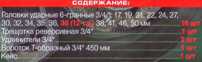 Набор инструментов ударных 3/4", 6гр, 21пр(17,19,21,22,24,27,30,32,34,35,36,36-12гр,38,41,46,50мм), 59088 RF-6212-5MPB