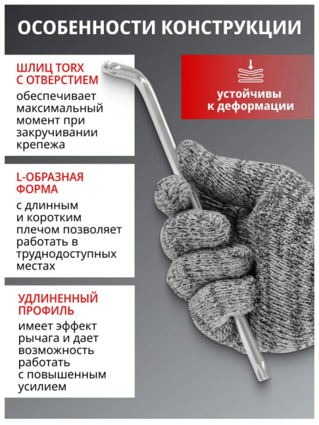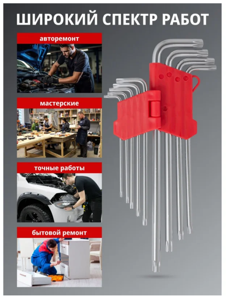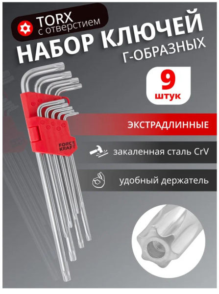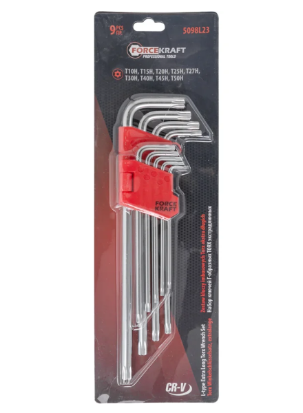 Набор ключей TORX Г-образных экстра длинных 9 предметов от бренда FORCEKRAFT. TORX-ключи с формой "Г" и экстра длиной, а также с отверстием, используются для работы с различными типами винтов. Этот тип ключей позволяет работать в труднодоступных местах и обеспечивает надежное вращение винтов с глубокими канавками в головке. Отверстие, которое находится в центре головки ключа TORX, позволяет работать с винтами, имеющими центральный штифт или выступ, а также предотвращает повреждение головки винта и ключа. Оно также может быть использовано для применения дополнительной силы с помощью плоского отвертки или другого инструмента. Экстра длинные ключи TORX обладают большей длиной, чем стандартные ключи, что особенно полезно при работе с электроникой или при сборке сложных механизмов. Размер - Т10, Т15, Т20, Т25, Т27, Т30, Т40, Т45, Т50.
