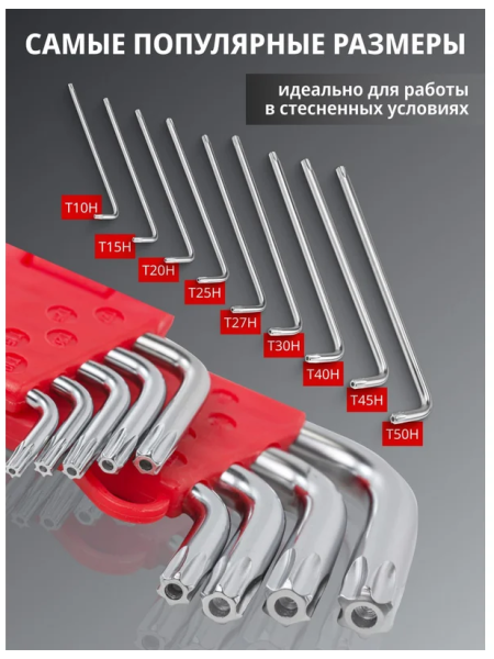 Набор ключей Г-образных TORX экстра длинных c отверстием CR-V, 9пр. (Т10,15,20,25,27,30,40,45,Т50), на пластиковом держателе