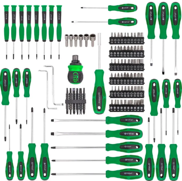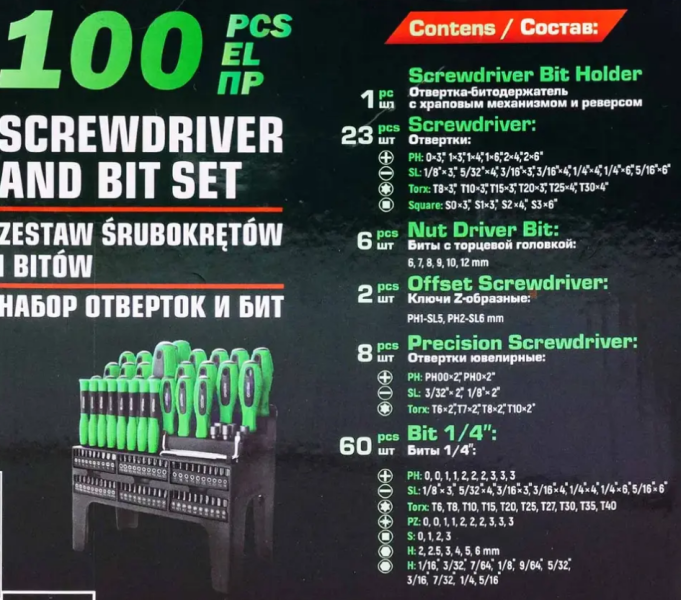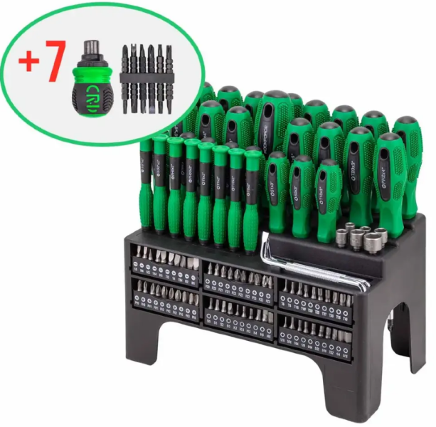 Огромное разнообразие 100 предметов: отвертки, биты, ключи, торцевые головки и храповая рукоятка — всё в одном наборе.