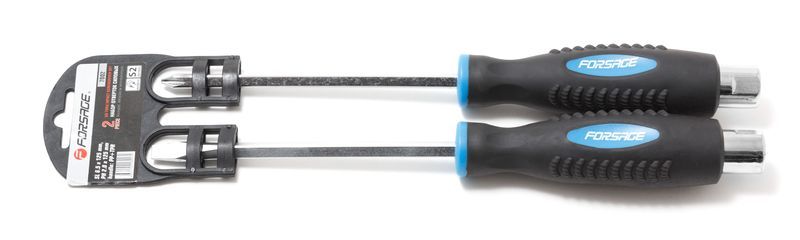 Набор отверток силовых с магнитными наконечниками 2 предметов в пластиковом держателе - это удобный и надежный инструмент для работы с крепежными элементами. В набор входят две отвертки разной длины и диаметра рабочей части: SL6.5х125мм, РН2х125мм. Отвертки имеют магнитные наконечники, которые позволяют легко захватывать и удерживать крепежные элементы, что делает работу более быстрой и удобной. Набор отверток предназначен для использования профессионалами, поэтому все инструменты изготовлены из высококачественной стали S2, которая обеспечивает высокую прочность и долговечность. Рукоятка каждой отвертки имеет эргономичную форму, что обеспечивает удобство при работе и снижает риск повреждения рук. В основании каждой рукоятки предусмотрено сквозное отверстие, которое позволяет подвешивать инструмент на гвоздь или крючок. Благодаря магнитным наконечникам, отвертки не скользят по поверхности детали и не повреждают ее. На конце каждой рукоятки имеется специальный ударный наконечник с пазами для вращения при помощи гаечного ключа.