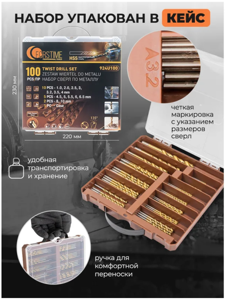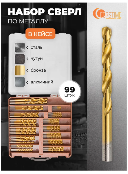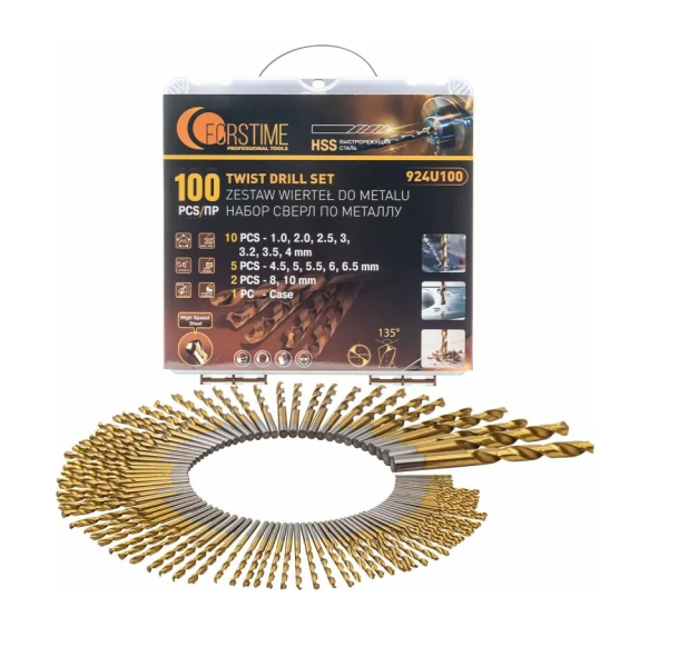 Набор сверл FORSTIME предназначен для сверления отверстий в металлических изделиях. В комплекте 100 предметов, что позволяет решать широкий спектр задач в металлообработке. Сверла изготовлены из высококачественной быстрорежущей стали (HSS) с кобальтовым покрытием, обеспечивающим стойкость к износу, высокую скорость сверления и длительный срок службы. Конструкция с прокатной U-образной спиралью способствует эффективному удалению стружки и чистому выполнению отверстий. Цилиндрический хвостовик делает набор совместимым с различными электроинструментами: дрелью, перфоратором, шуруповертом и сверлильным станком. Все элементы аккуратно размещены в пластиковом кейсе.