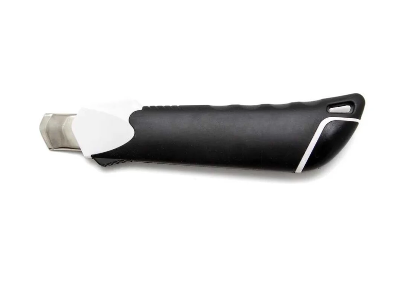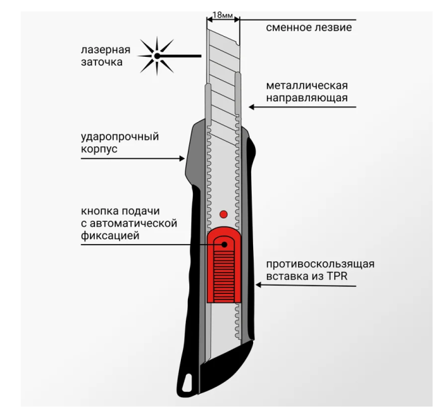 Предназначен для разрезания бумаги, картона, пластика, ткани. Лезвие ножа имеет лазерную заточку, создающую ровную и прочную режущую кромку. Алюминиевый корпус и направляющая из нержавеющей стали обеспечивают безопасную работу: лезвие не смещается и не раскалывает корпус ножа. Автоматический замок: при нажатии кнопки лезвие сдвигается, после отпускания кнопки фиксируется. Нож выдержит падение на твердую поверхность с высоты более 5 метров. Пластиковая вставка на рукоятке не даст инструменту выскользнуть из вашей ладони, создает упор для пальцев при давлении ножа на материал.