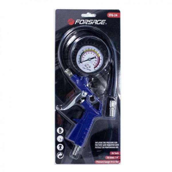 Пистолет для подкачки шин с манометром и шлангом в блистере.Рабочее давление: 0-8.5 Bar
