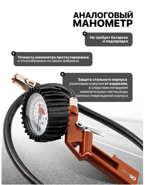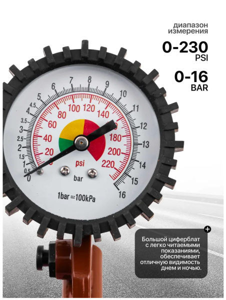 Точность измерений: Оснащен аналоговым манометром с диапазоном до 16 бар, что позволяет точно контролировать давление в шинах, обеспечивая их оптимальное состояние и безопасность на дороге.