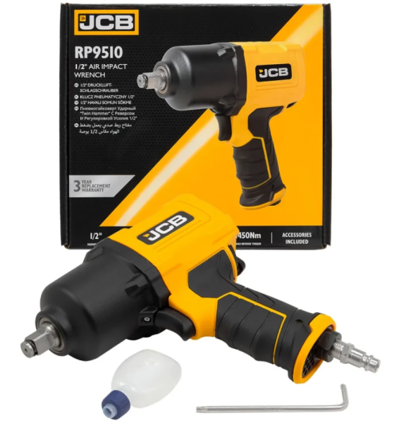 Пневмогайковерт ударный 1/2'' "Twin Hammer" с реверсом и регулировкой усилия от британского бренда JCB представляет собой инструмент, предназначенный для использования в сборочных цехах предприятий и на станциях технического обслуживания автомобилей, а также может с успехом применяться в условиях домашней автомастерской.