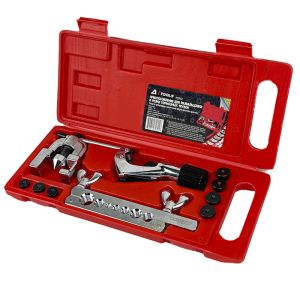 В комплекте вы найдете струбцину для развальцовки конусом. Все они помещены в фирменный красный кейс от производителя, где элементы удачно и аккуратно размещаются. Все инструменты изготовлены из высококачественных видов стали, которые обладают высокими эксплуатационными характеристиками.
