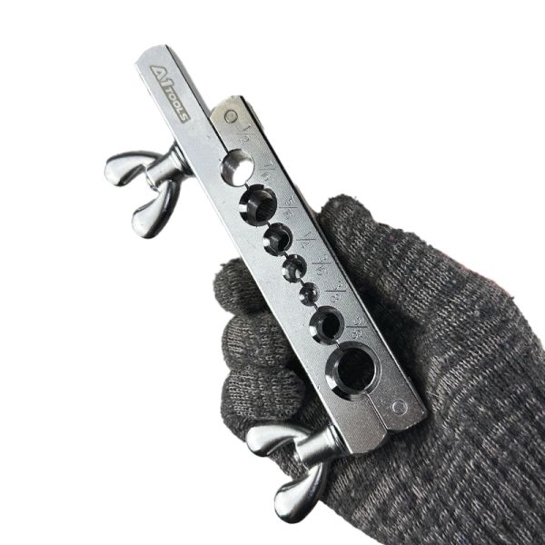 Набор для развальцовки труб включает в себя 10 предметов для развальцовки и резки труб из различных материалов, среди которых медь, латунь, алюминий и другие.